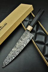 Klinge: Handgeschmiedeter Damast, 63 HRC, 215 mm