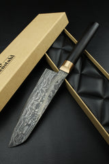Klinge: Handgeschmiedeter Damast, 63 HRC, 180 mm