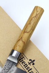 Der Ovale Griff wurde aus Olivenholz gefertigt, durch den hohen Ölanteil findet dieses Holz bei sehr vielen Kücheninstrumenten seinen Einsatz und besticht durch seinen mediterranen Flair.