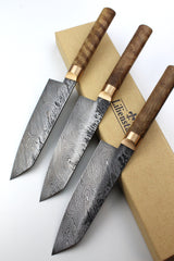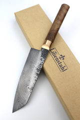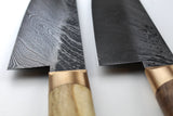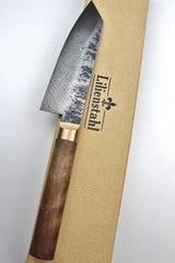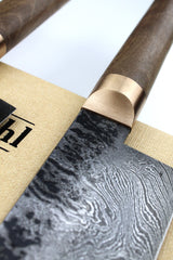 Die Klingenform entspricht dem V1, diesmal jedoch aus Damaststahl gefertigt. Die Schmiedehaut verleiht der Klinge eine entkohlte Randschicht, wodurch der Klingenrücken eine höhere Elastizität erhält und die Bruchfestigkeit deutlich steigt. Gleichzeitig bleibt so der ursprüngliche Schmiedeprozess sichtbar und in der fertigen Klinge nachvollziehbar. Damaststahl zählt zu den edelsten Materialien für Kochmesser.
