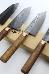 Die Klingenform entspricht dem V1, diesmal jedoch aus Damaststahl gefertigt. Die Schmiedehaut verleiht der Klinge eine entkohlte Randschicht, wodurch der Klingenrücken eine höhere Elastizität erhält und die Bruchfestigkeit deutlich steigt. Gleichzeitig bleibt so der ursprüngliche Schmiedeprozess sichtbar und in der fertigen Klinge nachvollziehbar. Damaststahl zählt zu den edelsten Materialien für Kochmesser.