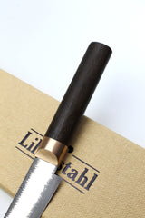 Glänzend durchziehen die Markstrahlen der tausende Jahre alten Mooreiche den Griff des Pettys. Nur der Geruch verrät die natürliche und ökologisch vertretbare Stabilisierung mit Lärchen und Fichtenharz gegen Feuchtigkeit und Gerüche. Die quer satinierte Zinnbronze bildet das Kernstück zwischen der San Mai 3LN Klinge und dem East Style Oval Griff ausgeführt als echte Zwinge. Die Diffusionszone zwischen dem Mantelmaterial und der Schneidlage der Klinge erlauben einen Einblick in das traditionelle Schmiedeverfahren.