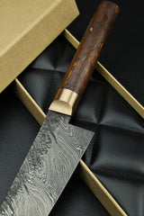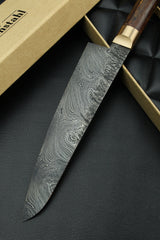 Klinge: Handgeschmiedeter Damast, 63 HRC, 215 mm