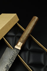 Klinge: Handgeschmiedeter Damast, 63 HRC, 215 mm