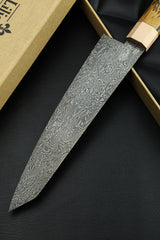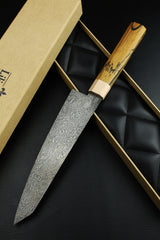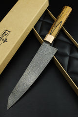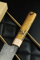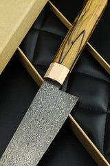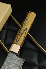 Blau, Schwarz, Silber oder Grau - die Schattierungen unserer vier Hauptstähle spiegeln sich im Damast in Form von Sternen wider. Die meisten Menschen kennen den Vergleich 'Schwarz wie Ebenholz', es gibt jedoch eine noch exklusivere Verwandtschaft, nämlich schwarz-weißes Ebenholz, dessen genauere Bezeichnung B&W Royal Ebony ist. Wir haben ein kleines Kontingent erworben, das seit ca. 50 Jahren getrocknet wurde, und es wirkt so, als hätte dieses besondere Holz nur auf unseren Damaststahl in Form Y.1 gewartet. .