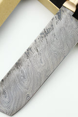 Klinge: Handgeschmiedeter Damast, 63 HRC, 180 mm