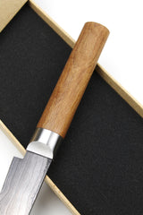Die Klinge besteht aus hochqualitativem, mehrfach gefaltetem Damaststahl, der für seine außergewöhnliche Härte und Langlebigkeit bekannt ist. Wir erreichen somit ein Vielfaches der Schnitthaltigkeit von herkömmlichen Kochmessern.