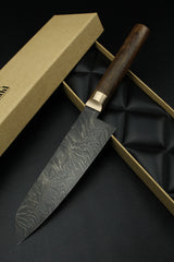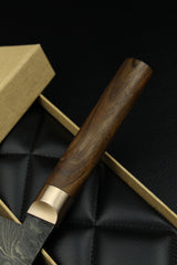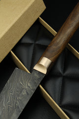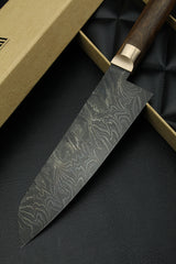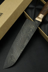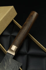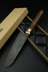 Klinge: Handgeschmiedeter Damast, 63 HRC, 180 mm