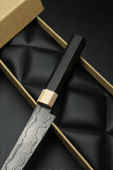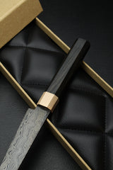Die Klinge besteht aus hochqualitativem, mehrfach gefaltetem Damaststahl, der für seine außergewöhnliche Härte und Langlebigkeit bekannt ist. Wir erreichen somit ein Vielfaches der Schnitthaltigkeit von herkömmlichen Kochmessern.