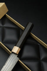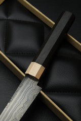 Die Klinge besteht aus hochqualitativem, mehrfach gefaltetem Damaststahl, der für seine außergewöhnliche Härte und Langlebigkeit bekannt ist. Wir erreichen somit ein Vielfaches der Schnitthaltigkeit von herkömmlichen Kochmessern.