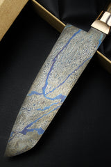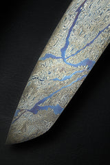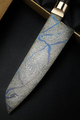 Blau, Schwarz, Silber oder Grau - die Schattierungen unserer vier Hauptstähle spiegeln sich im Damast in Form von Sternen und komplexen Mustern wider. Die meisten Menschen kennen den Vergleich 'Schwarz wie Ebenholz', es gibt jedoch eine noch exklusivere Verwandtschaft, nämlich schwarz-weißes Ebenholz, dessen genauere Bezeichnung B&W Royal Ebony ist. Wir haben ein kleines Kontingent erworben, das seit ca. 50 Jahren getrocknet wurde, und es wirkt so, als hätte dieses besondere Holz nur auf unseren Damaststahl in Form H gewartet. .